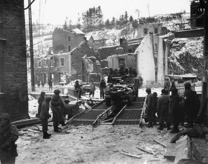 1945年1月,在突出部战役期间,一辆美国陆军半履带运兵车穿过乌尔特河上的一座临时桥梁。这座桥位于比利时城市乌法利兹。↓