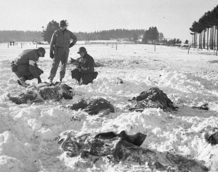 1945年1月,美军士兵在比利时马尔梅迪确认被德军射杀的美军同袍身份。↓