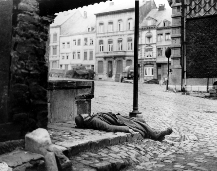 1945年1月2日,一名阵亡德国士兵躺在比利时斯塔沃洛的街角。↓