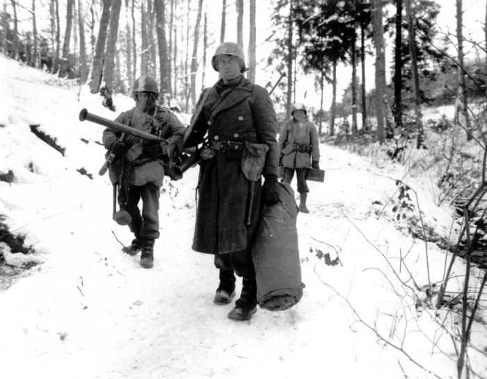 1945年1月4日,美国第290团的步兵携带步枪和反坦克火箭筒,穿过雪后的比利时Amonines森林。↓