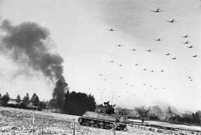 1945年1月6日,在低空飞行的C-47运输机为被德军围困在巴斯通尼的美军带来了补给。↓