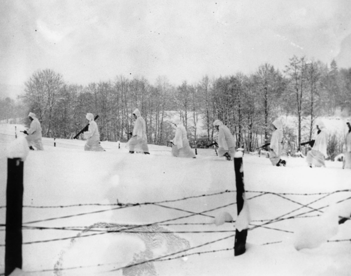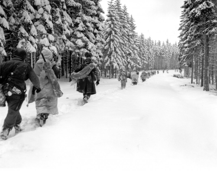 1945年1月28日,第82空降师部队在冰雪覆盖的阿登森林中行军。↓