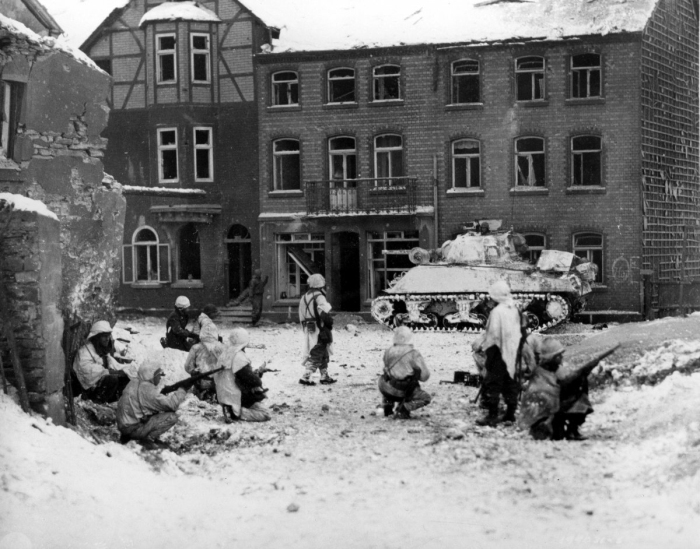 1945年1月23日,美军第7装甲师在比利时圣维特(Saint Vith)街道上搜索狙击手。↓