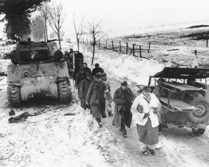 1945年1月25日,比利时福伊(Foy),突出部战役的最后一段时间,德军俘虏被美军领向战俘营,路过一辆已无法使用的坦克。↓