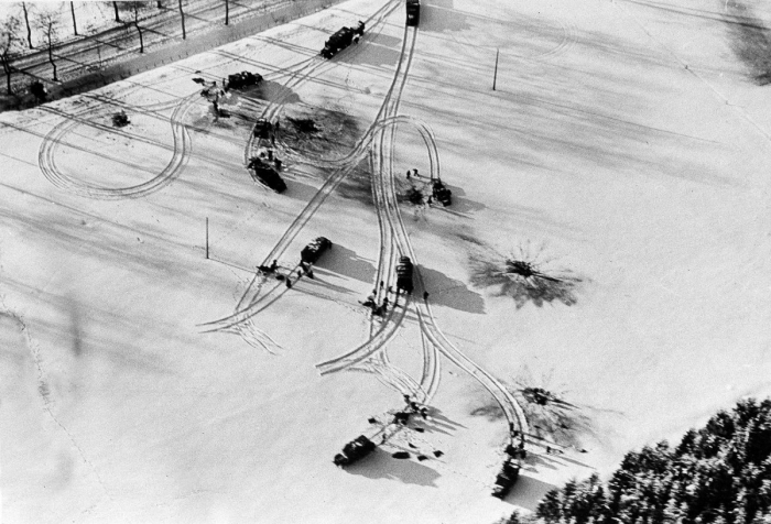 1945年1月27日,一支盟军小队在阿登地区冰雪覆盖的野外休息,周围尽是车轮的痕迹和黑色的弹坑。↓