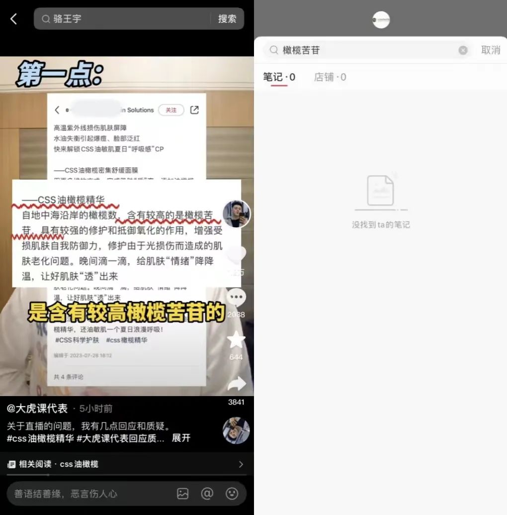 也就是说,品牌方在公开宣传中就曾表示CSS油橄榄精华中含有橄榄苦苷这一成分,和骆王宇此前回应相左。截至发稿,青眼在CSS希妍萃品牌官方小红书账号中搜索“橄榄苦苷”,未能搜索到相关内容,目前相关内容或已被删除。