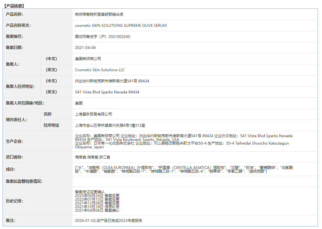 青眼调查发现,据国家药监局官网公开信息显示,备案名为“希妍萃橄榄积雪草舒颜精华液”的产品属于进口普通化妆品,其成分列表中第一为水,第二和第三位是“油橄榄叶提取物”和“积雪草提取物”。