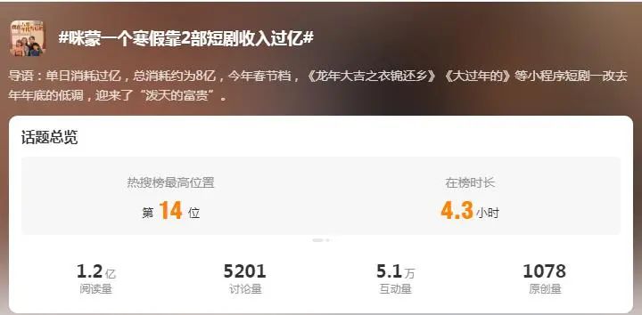 不过需要注意的是,短剧迎来爆发的同时入局者也众多。因此,想要在众多短剧中脱颖而出,创新的故事情节、独特的视觉效果、引人入胜的角色不可或缺。而咪蒙能东山再起,也着实说明了其能力。典型如,近期,微博热搜还出现了#咪蒙一个寒假靠2部短剧收入过亿#的话题。虽然,该话题消息的真实性还有待考证,但不难看出的是,咪蒙在短剧领域的影响力已可见一斑。