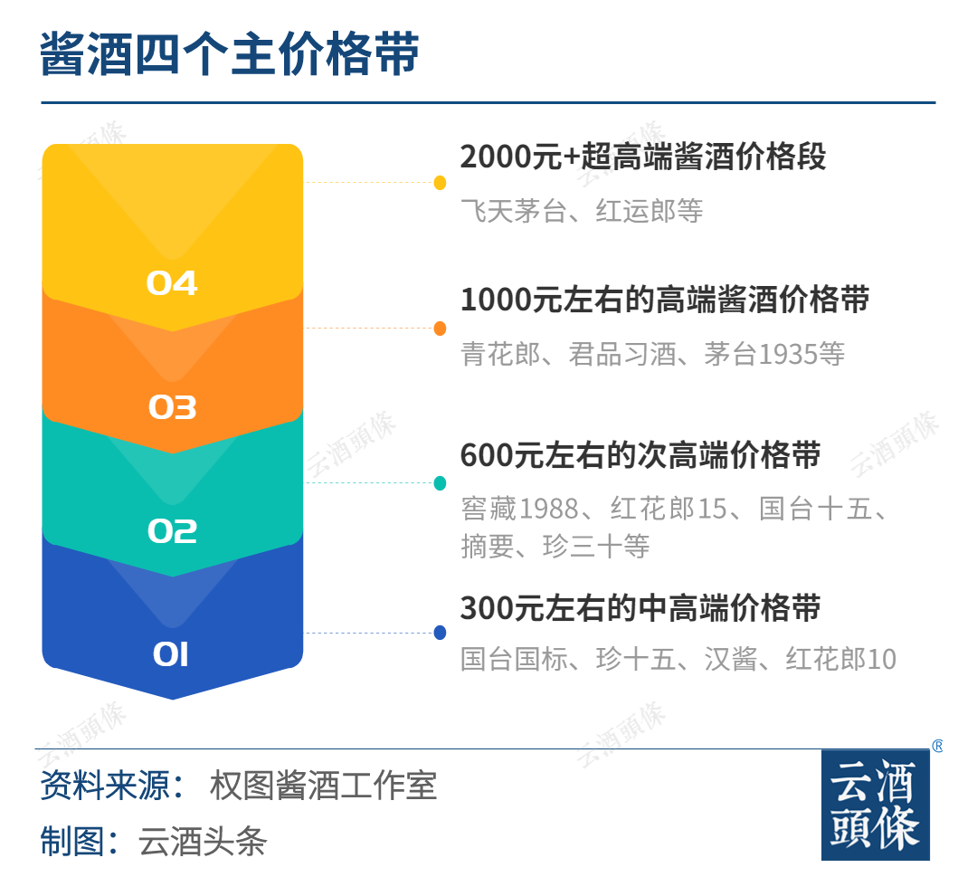 四个主价格带形成:2000元以上的超高端酱酒价格段(飞天茅台、红运郎等),1000元左右的高端酱酒价格带(青花郎、君品习酒、茅台1935等),600元左右的次高端价格带(窖藏1988、红花郎15、国台十五、摘要、珍三十等),300元左右的中高端价格带(国台国标、珍十五、汉酱、红花郎10等)。