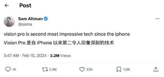 苹果Vision pro发售后,一跃成为迄今最先进的虚拟现实和增强现实眼镜,苹果公司将其称为“空间计算设备”。OpenAI的创始人兼CEO山姆·奥特曼评价:苹果Vision pro是自iPhone以后第二惊艳的技术。
