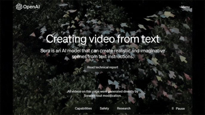 Sora取自日语单词,意为“天空”,引申含义还有“自由”。在Sora官网页面,无数只纸飞机在自由飞翔,行动自主,最后汇集成一片天空的背景色。