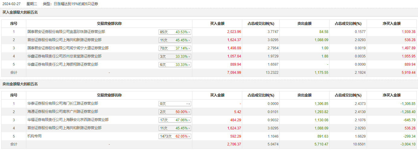 东田微2月27日涨停,全天换手率31.75%,成交额5.36亿元,振幅23.77%。龙虎榜数据显示,机构净卖出299.34万元,营业部席位合计净买入2678.40万元。深交所公开信息显示,当日该股因日收盘价涨幅达20.00%上榜,机构专用席位净卖出299.34万元。上榜的前五大买卖营业部合计成交1.40亿元,其中,买入成交额为8176.99万元,卖出成交额为5797.93万元,合计净买入2379.07万元。