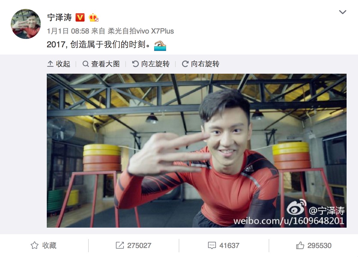 社交网络主宰注意力和流量的当下,话题性与关注度才是品牌在意的事情,宁泽涛无论在外形、身材还是社交网络的被讨论程度,他都是品牌代言合适的人选。尤其是对年轻一代的号召力,他身上贴着“小鲜肉”和“国民老公”的标签,每每出席活动都可以迎来“舔屏”的效果,譬如1 月 1 日宁泽涛在新浪微博上发布了一张穿着阿迪达斯衣服的照片,暗示自己成为该品牌的代言人,目前则条微博的转发量为27.5万,而他也拥有800万的微博粉丝。