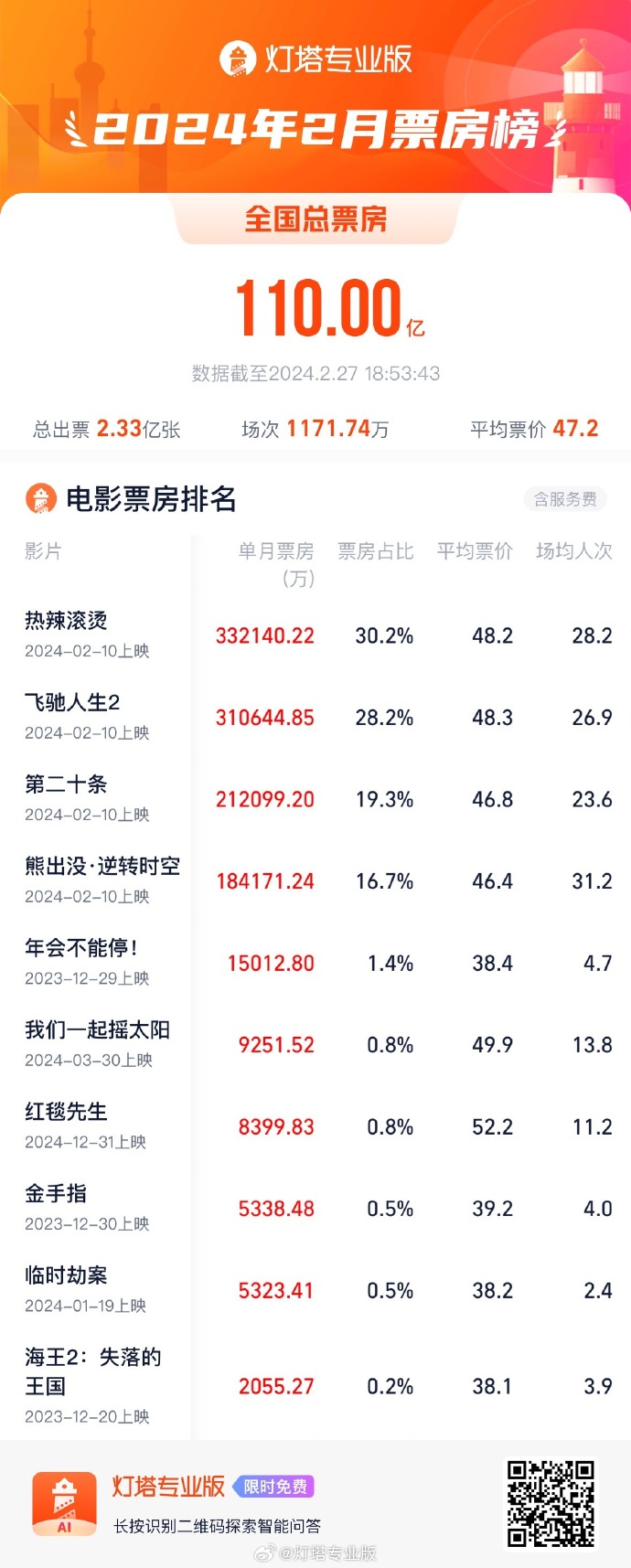 据灯塔专业版数据,截至2月27日18时53分,2024年2月总票房(含预售)破110亿。《热辣滚烫》《飞驰人生2》《第二十条》暂列本月票房前三位。 本月票房也成为当前中国影史单月票房第三位。