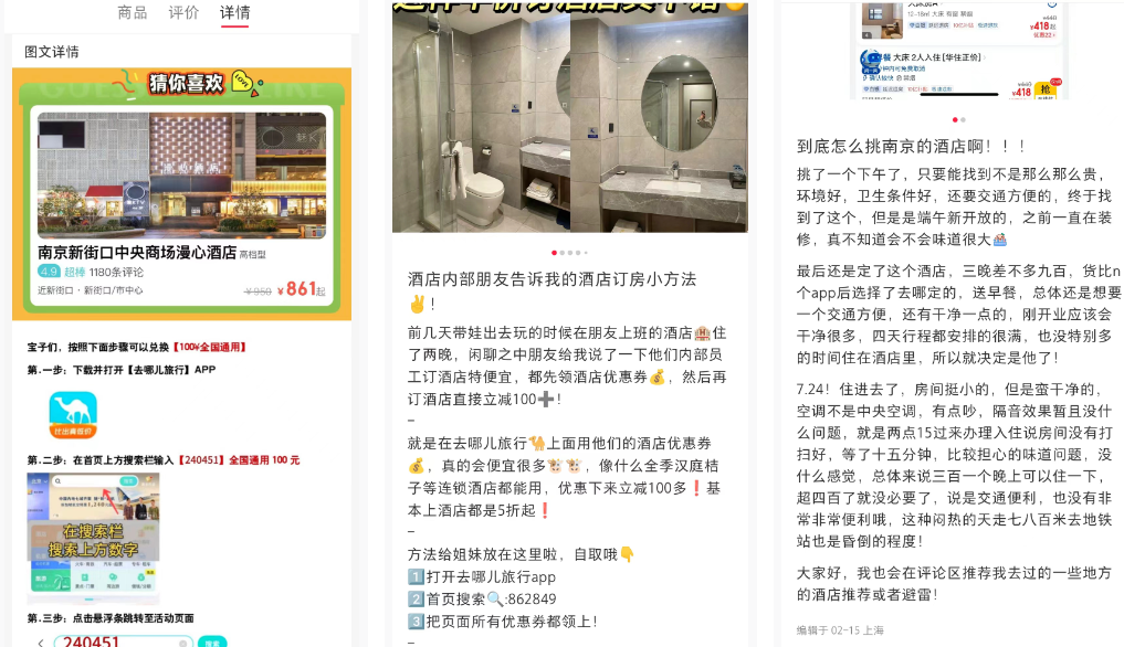 带着这样的猜想,小编便跑去小红书、抖音里寻找些蛛丝马迹。由于酒店基本占据了旅游的大头,在这里,我们就针对携程系、美团的酒店业务进行搜索。