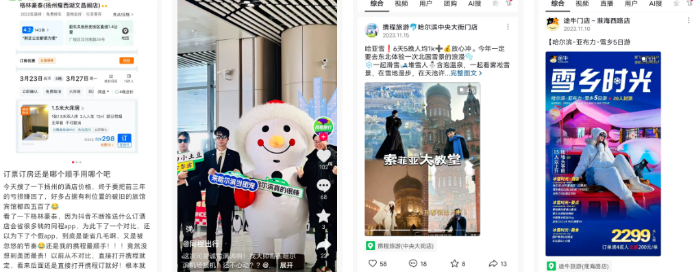 相比于小红书,抖音的内容更接地气些、一遍又一遍地给打工人洗脑。“当我刚看完哈尔滨冰雪大世界的景色、吉林长春可喂食的‘猴’,抖音已经开始给我推荐酒店下单链接了”,南京的小金也赶在春节期间完成了自己的东北五日游,除了小金之外,身边至少有三个人向小编发起了东北游的邀请。