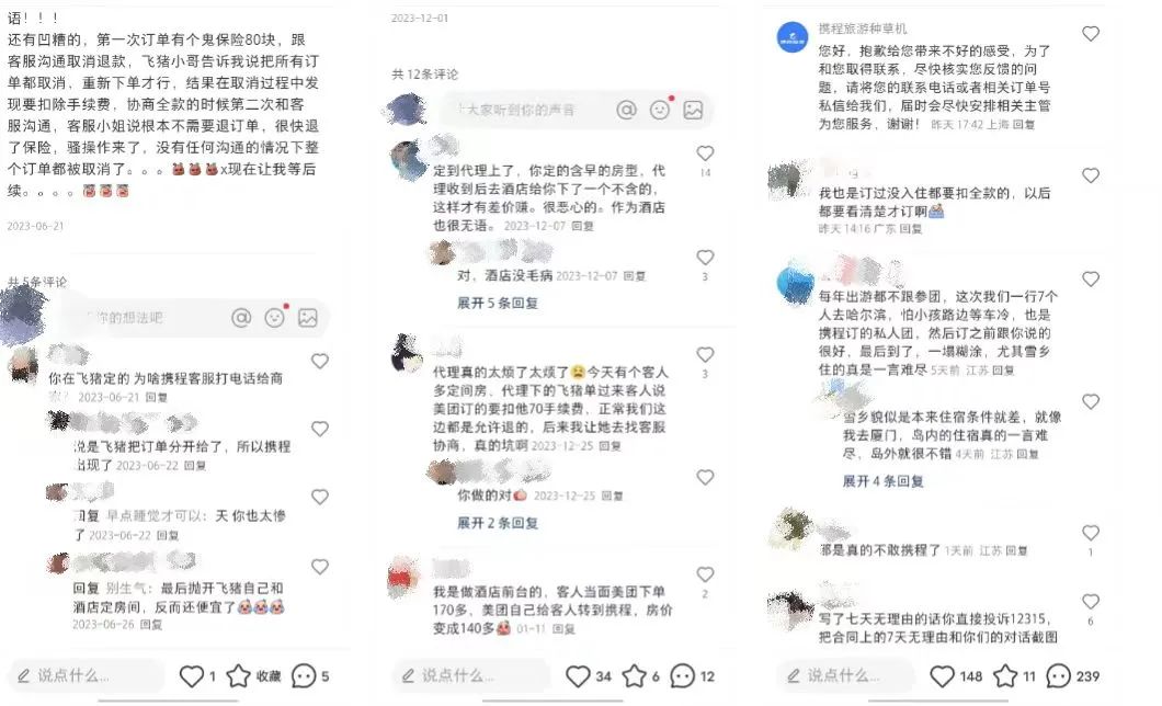 据观测,除了去哪儿旅行之外,小红书关于携程、同程、美团的评论较为真实,没有为了黑而黑的情况。而看了N个差评帖子之后,小编发现,每家被吐槽的点各不相同。
