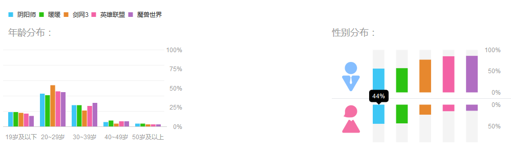 我们可以用百度指数对市面上主要的游戏性别分布进行分析和估算。我们可以看到,阴阳师的女性搜索比率高达44%,甚至高过了暖暖的43%。这还只是基于PC端的搜索数据,而实际上中国女性使用网络更加集中于手机情境下。