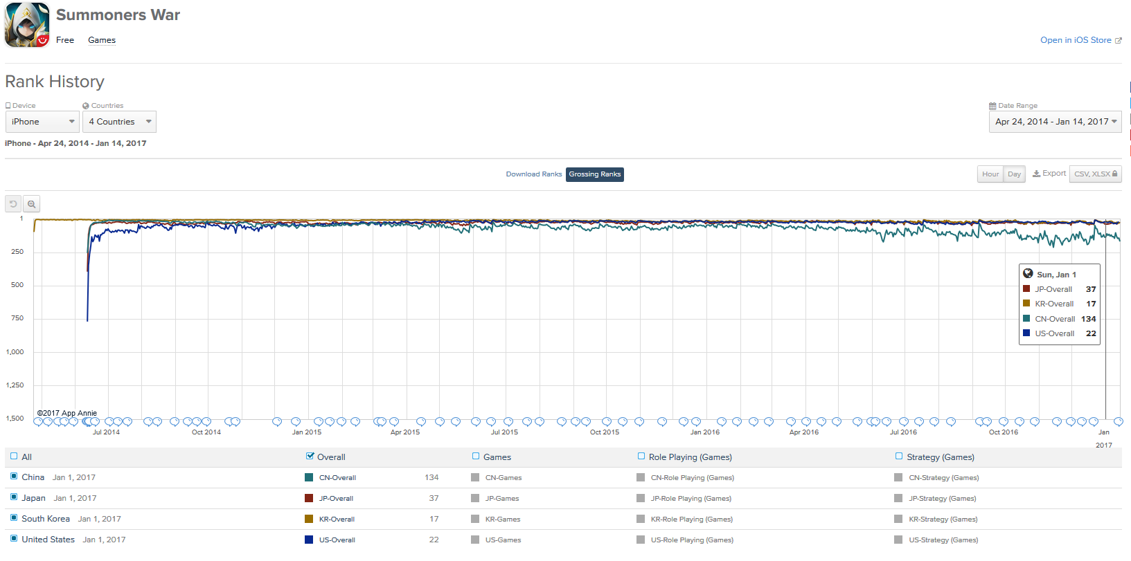 而且,在分裂极其严重的各国手游市场中,它创下了一个很少有人能达成的成就:《魔灵召唤》虽然排名不高,却是一款在各主要市场内都颇受好评的手机游戏。这款游戏从2014年6月开始进入全球市场,在长达两年的时间内,在所有市场内的成绩都保持在收入榜50名以内,并全都达成过收入榜前10的佳绩。时至今日,它仍然在日本和美国这样的巨大市场中保持着收入榜30名前后的位置,而在中国虽受到《阴阳师》的巨大冲击,也仍然坚守在排行榜的100名左右。这些数据表明,《魔灵召唤》毫无疑问是一款出色的手机游戏。