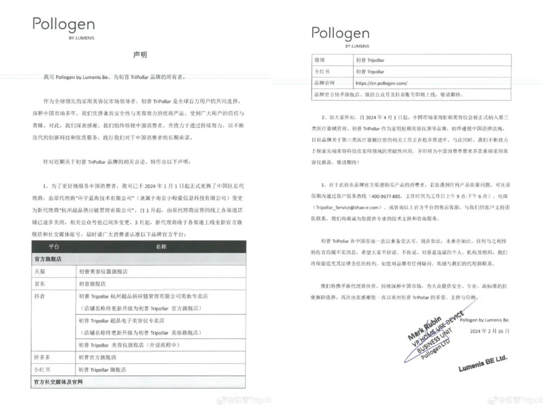 一、初普品牌已于2024年1月1日起正式更换了中国区总代理商,新代理商为“杭州超品供应链管理有限公司”。基于此,1月起,由原代理商运营的线上各渠道店铺已逐步关闭,相关公众号也已同步变更。3月起,新代理商将在天猫、京东、抖音、快手、拼多多、小红书、微博、微信等平台上线全新官方旗舰店及社交媒体账号。二、鉴于自 2024年4月1日起,中国市场家用射频美容仪会被正式纳入第三类医疗器械管理。初普目前关于第三类医疗器械注册的相关工作正在稳步推进中。与此同时,品牌还将有多款家用美容仪新品面世。三、此前在初普品牌官方渠道购买产品的消费者,如遇到产品质量问题,可在产品质保期内通过客服热线或线上官方客服,进行咨询。