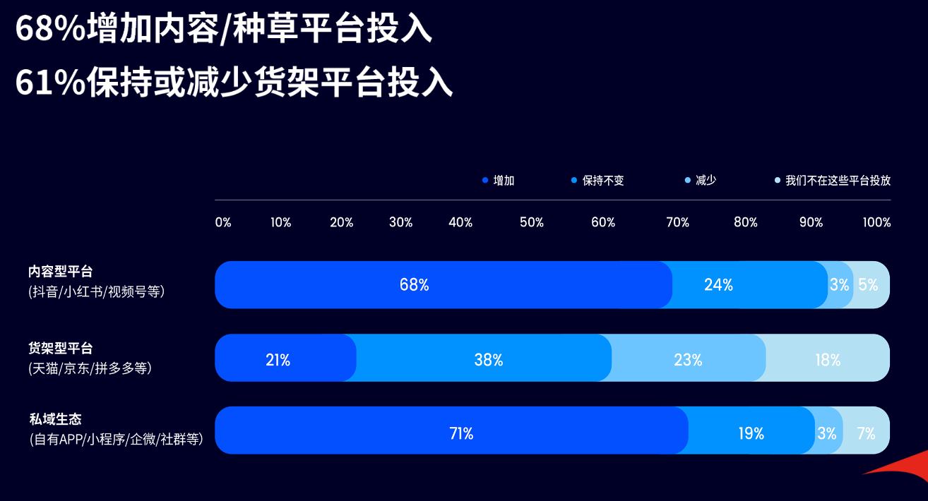上述白皮书的另一组数据就能说明问题。过去一年,68%的品牌增加在抖音、小红书、视频号等内容/种草平台的投入,而61%的品牌则保持或减少天猫、京东、拼多多等货架平台的投入。