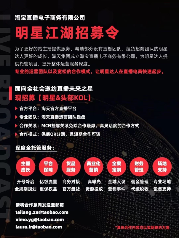 2月20日,淘天集团发布了一份“江湖招募令”,宣布成立一家新的直播电商公司,为有意入淘开播的明星、KOL、MCN机构提供全托管运营服务。
