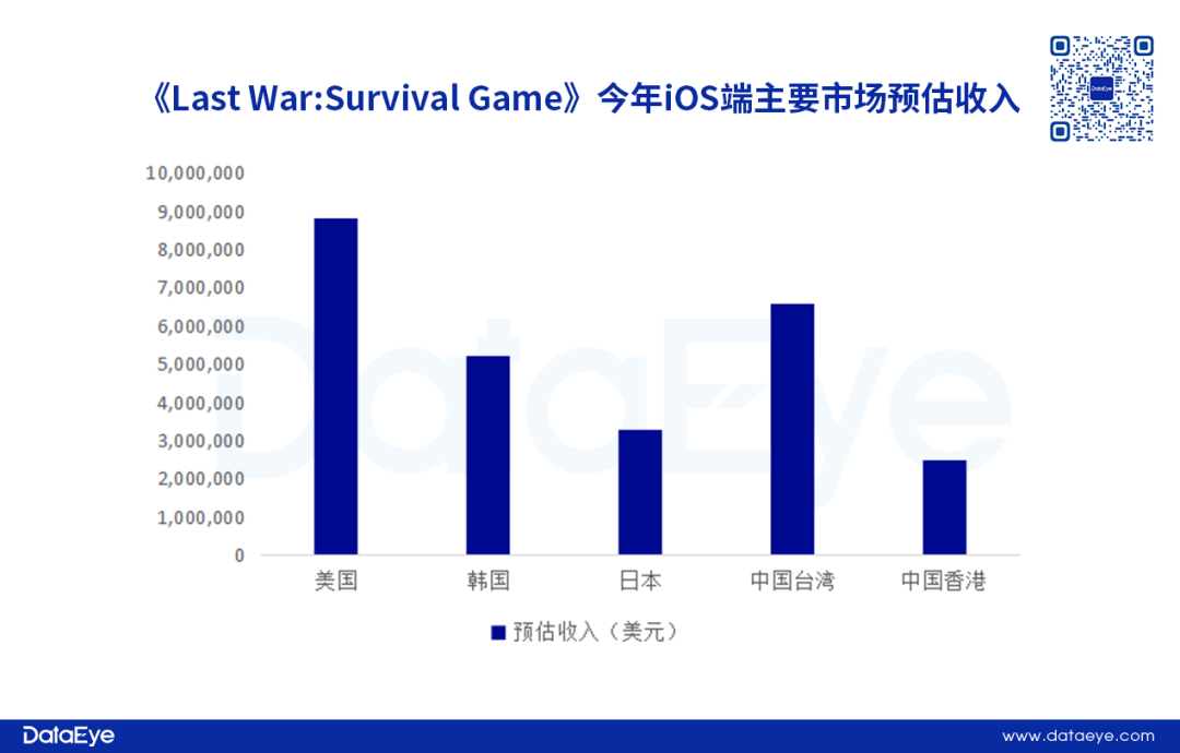 Sensor Tower数据显示,《Last War:Survival Game》进入2024年之后表现强势。截至2月25日,美国iOS端预估收入超过880万美元,中国台湾iOS端预估收入约为660万美元,韩国iOS端则同样超过500万美元,并且多次登顶韩国市场iOS畅销榜榜首。
