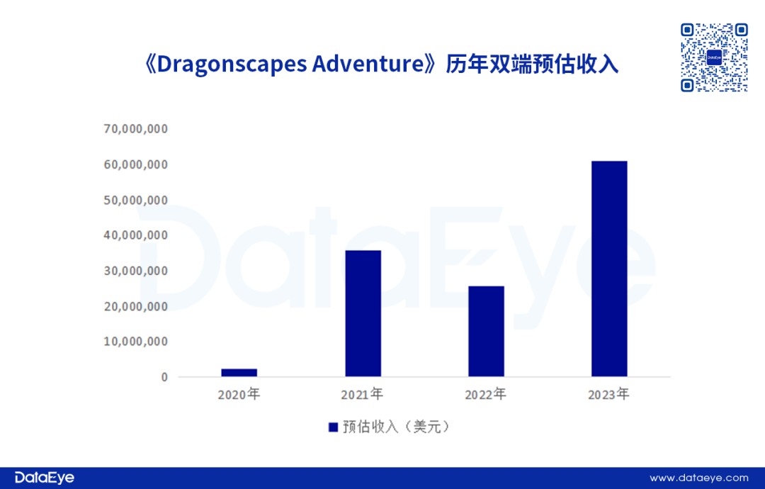 《Dragonscapes Adventure》在2020年已经上线,是一款“模拟经营”产品。在2021年高峰和2022年收入回落之后,2023年凭借多种“副玩法”素材,让产品重回高峰。点点数据显示,《Dragonscapes Adventure》在2023年全球市场双端总预估收入超6000万美元。对比往年的预估收入,2023年同比增长超过100%。