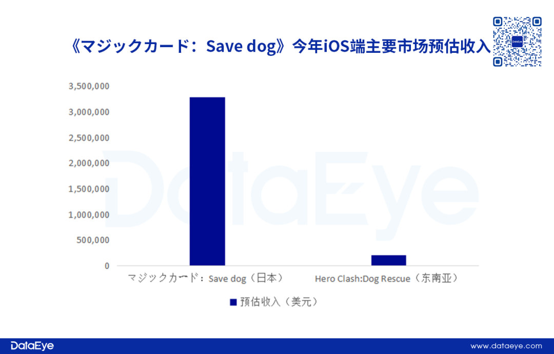 收入方面,《マジックカード:Save dog》进入2024年之后,日本地区iOS端预估收入约为328万美元,对于其原版本《Hero Clash:Dog Rescue》(东南亚地区为主)进入2024年之后iOS预估收入仅有21万美元。