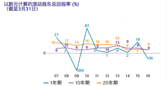 根据淡马锡官网公布的数字,截至2016年3月31日,以新元计算的1年期股东总回报率为负9.02%,3年期为3.25%,10年期为6%、20年期股东总回报率为6%。而新加坡20年期的年化核心通货膨胀率低于2%。
