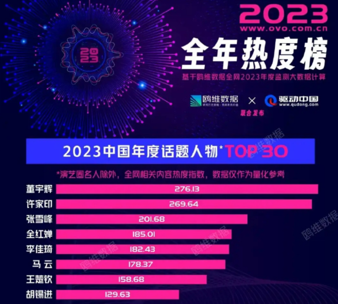 董宇辉是中国2023年话题度最高的人。鸥维数据联合驱动中国发布的2023全年热度榜上,董宇辉位居2023中国年度话题人物榜首,远高于同为直播带货大主播的李佳琦,也高于许家印、马云、俞敏洪等一众企业家。