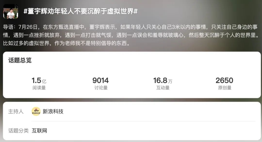 值得注意的是,微博的舆论场功能,至今仍然无法被取代。比如董宇辉拒绝讲内衣内裤的热搜,最先开始发酵的平台就是微博,而非其带货的抖音平台。