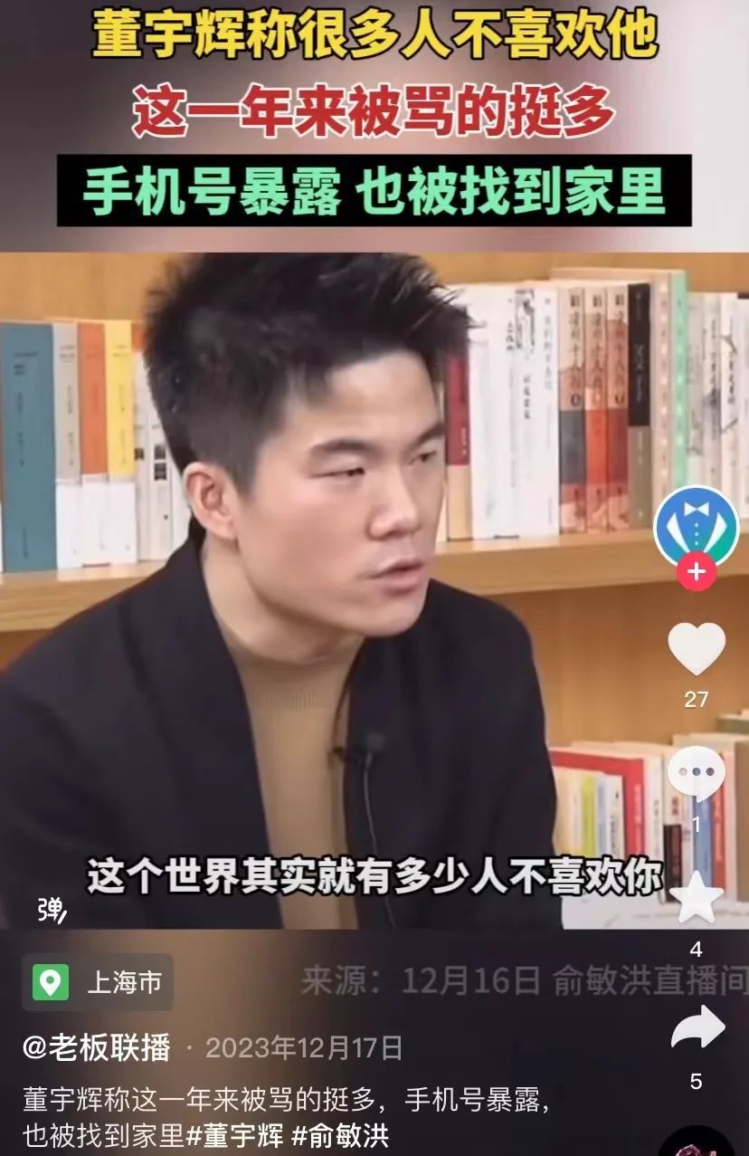 作为公众人物,董宇辉的一言一行原本就容易引发歧义和误解,热搜无疑将放大这一切。今年1月16日,董宇辉和俞敏洪、作家陈行甲在直播间对谈,谈到舆论情况时董宇辉说,“有些人自己做不到,但要求你做圣人。他要求你手无棍棒,还要一心向阳。一群活在阴沟里的人,每天指责阳光耀眼。”