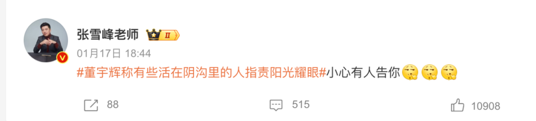 这段话一出来,立刻引发无数的解读。#董宇辉称有些活在阴沟里的人指责阳光耀眼#也登上了微博热搜,1.1亿阅读量的背后不乏对董宇辉的指责,有人认为这是他的自傲和讽刺。张雪峰也在微博上,带上这个话题戏谑留言称,“小心有人告你”。