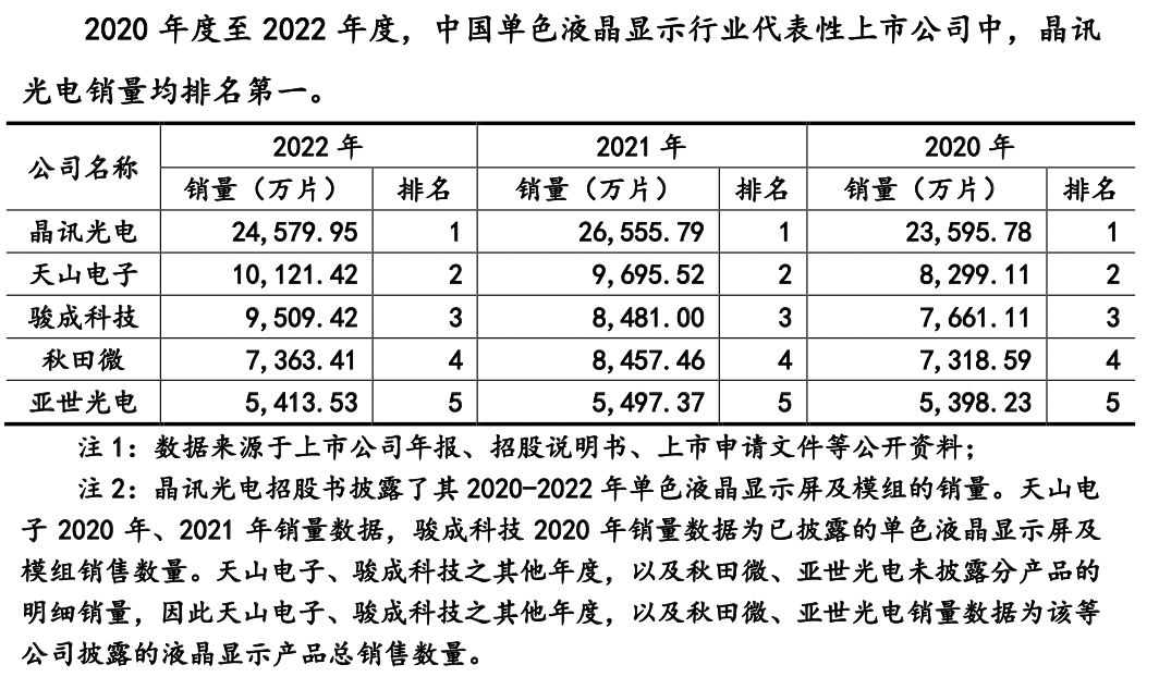 晶讯光电在招股书中表示,从竞争格局看,在从事单色液晶显示产品的代表性上市公司中,2020年至2022年,晶讯光电单色液晶显示产品销量排名第一。