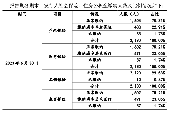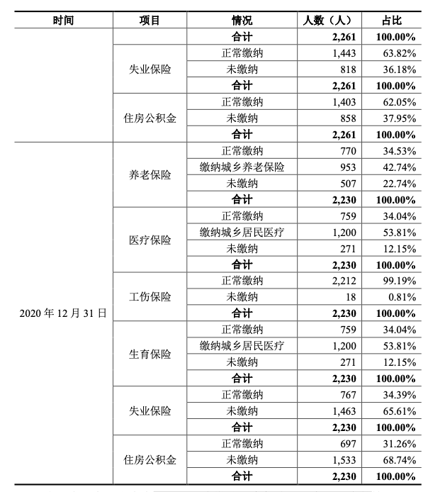 具体来看,2020年-2022年,除工伤保险未缴纳比例极低之外,晶讯光电的养老保险、医疗保险、生育保险随着各年未缴纳比例下滑。但值得注意的是,失业保险的未缴纳比例虽然下滑但仍然较高,分别为65.61%、36.18%、24.44%,未缴纳人数分别为1463人、818人、521人。