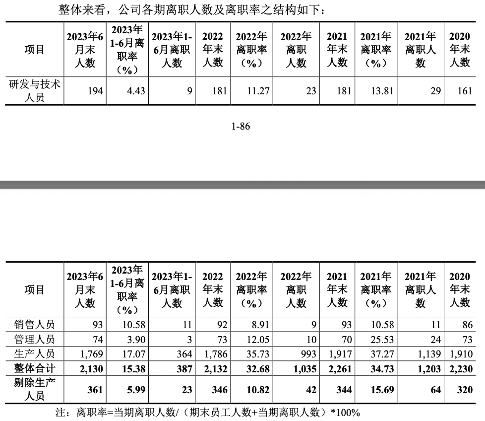 根据一轮问询回复显示,2021年-2022年,以及2023年上半年晶讯光电的离职率分别为34.71%、32.68%、15.38%,主要以生产人员为主,其他人员的离职率处于正常水平。