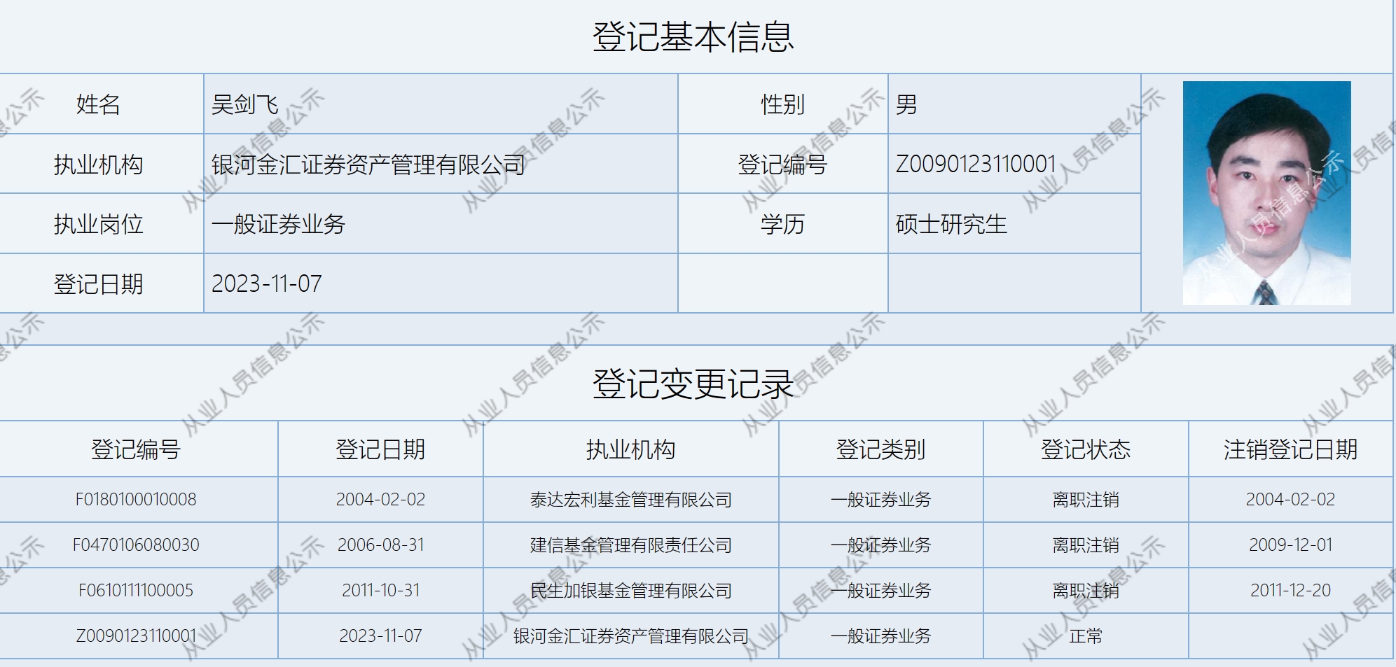 据银河金汇披露,吴剑飞在此次就任银河金汇董事长前,已于2023年12月加入银河金汇,担任公司执行委员会主任,兼任党总支书记。中国证券业协会显示,其本人加入银河金汇时间为2023年11月。