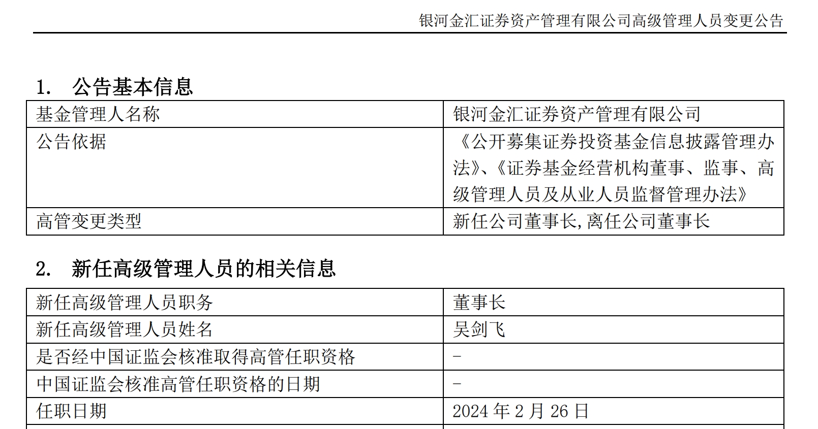 2024年2月28日,银河金汇证券资产管理有限公司(下称:银河金汇)发布高管变动,吴剑飞获委任为公司新任董事长,任职自2024年2月26日起。公司前任董事长刘冰因工作变动于同日离任。