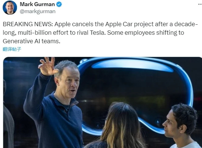 外媒报道称:苹果公司已于周二在内部宣布取消造车计划,让造车部门的员工转投入生成式AI研发。