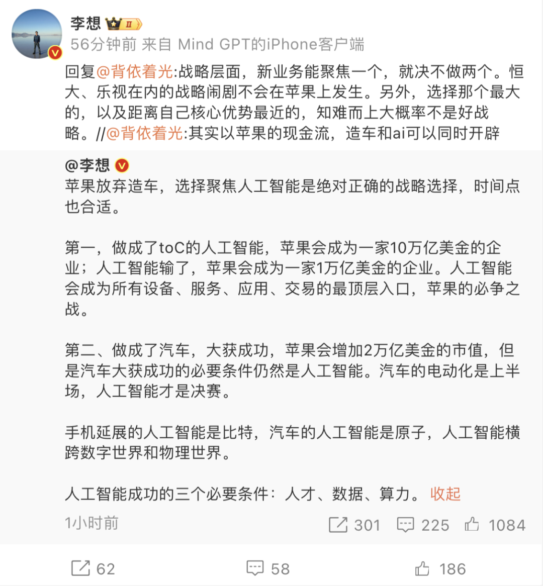理想汽车CEO李想则表示支持苹果的决定,称“选择聚焦人工智能是绝对正确的战略选择,时间点也合适”。并在回复网友“造车和AI双线作战”时表示,“战略层面,新业务能聚焦一个,就决不做两个。选择那个最大的,以及距离自己核心优势最近的,知难而上大概率不是好战略。”