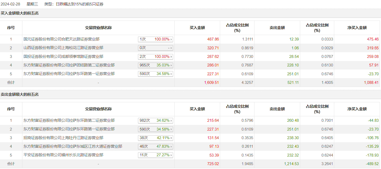 具体来看,东方财富证券拉萨东环路第二证券营业部、东方财富证券拉萨东环路第一证券营业部分别卖出260.48万元、251.01万元;国元证券合肥天达路证券营业部、山西证券上海松花江路证券营业部分别买入487.86万元、320.71万元。