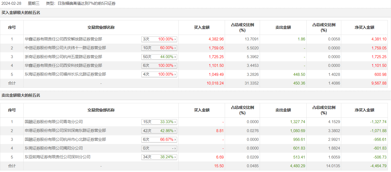 具体来看,华鑫证券西安解放路证券营业部、中信证券大庆纬十一路证券营业部分别买入4382.96万元、1759.05万元;国融证券青岛分公司、申港证券深圳深南东路证券营业部分别卖出1327.74万元、1080.69万元。