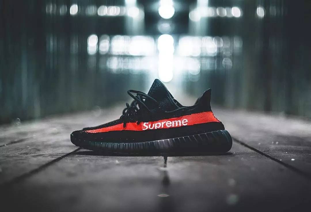 最无脑且效果最棒的做法,就是买一双黑红配色的Yeezy 350,然后请你学美术的朋友,用油漆直接在上面把Supreme 的字母涂上去。