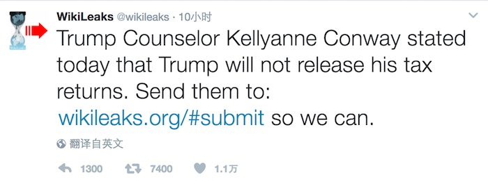 “特朗普顾问康韦(Kellyanne Conway)今天表明,特朗普不会公布他的纳税记录,”维基解密周日(1月22日)发布推文称,“把它们发到这儿https://wikileaks.org/#submit ,这样我们就可以公开了。”
