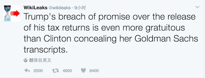 维基解密还对特朗普不公开纳税记录的做法表示谴责,称这比希拉里掩藏高盛内部讲话文件的做法还要恶劣。