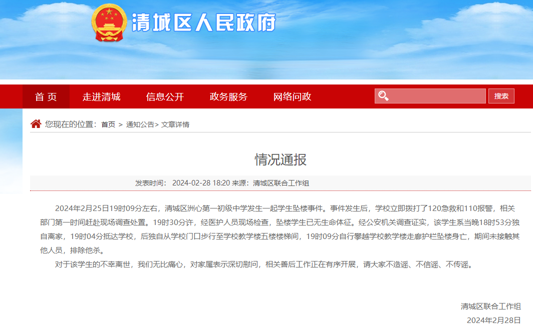 广东清远清城区2月28日通报,2月25日19时09分左右,清城区洲心第一初级中学发生一起学生坠楼事件。事件发生后,学校立即拨打了120急救和110报警,相关部门第一时间赶赴现场调查处置。19时30分许,经医护人员现场检查,坠楼学生已无生命体征。经公安机关调查证实,该学生系当晚18时53分独自离家,19时04分抵达学校,后独自从学校门口步行至学校教学楼五楼楼梯间,19时09分自行攀越学校教学楼走廊护栏坠楼身亡,期间未接触其他人员,排除他杀。