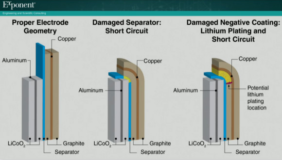 Exponent实验室对Note7的电池设计进行了测试。A电池阴极板损伤是主要原因,A电池的设计可能会导致隔离膜开裂和断裂,导致能量不均衡从而产生发热和燃烧。B电池的两级接片接合过程中存在缺陷,两级接片与两级极板之间的超声波焊接存在毛刺,且没有绝缘胶带。阳极板和阴极板因为接触导致短路。而且,B电池因为工艺问题存在突起,造成短路和过充电时的热失控。但Exponent认为三星Note7的电池回路网并不存在问题,不会对AB两家电池产生影响。