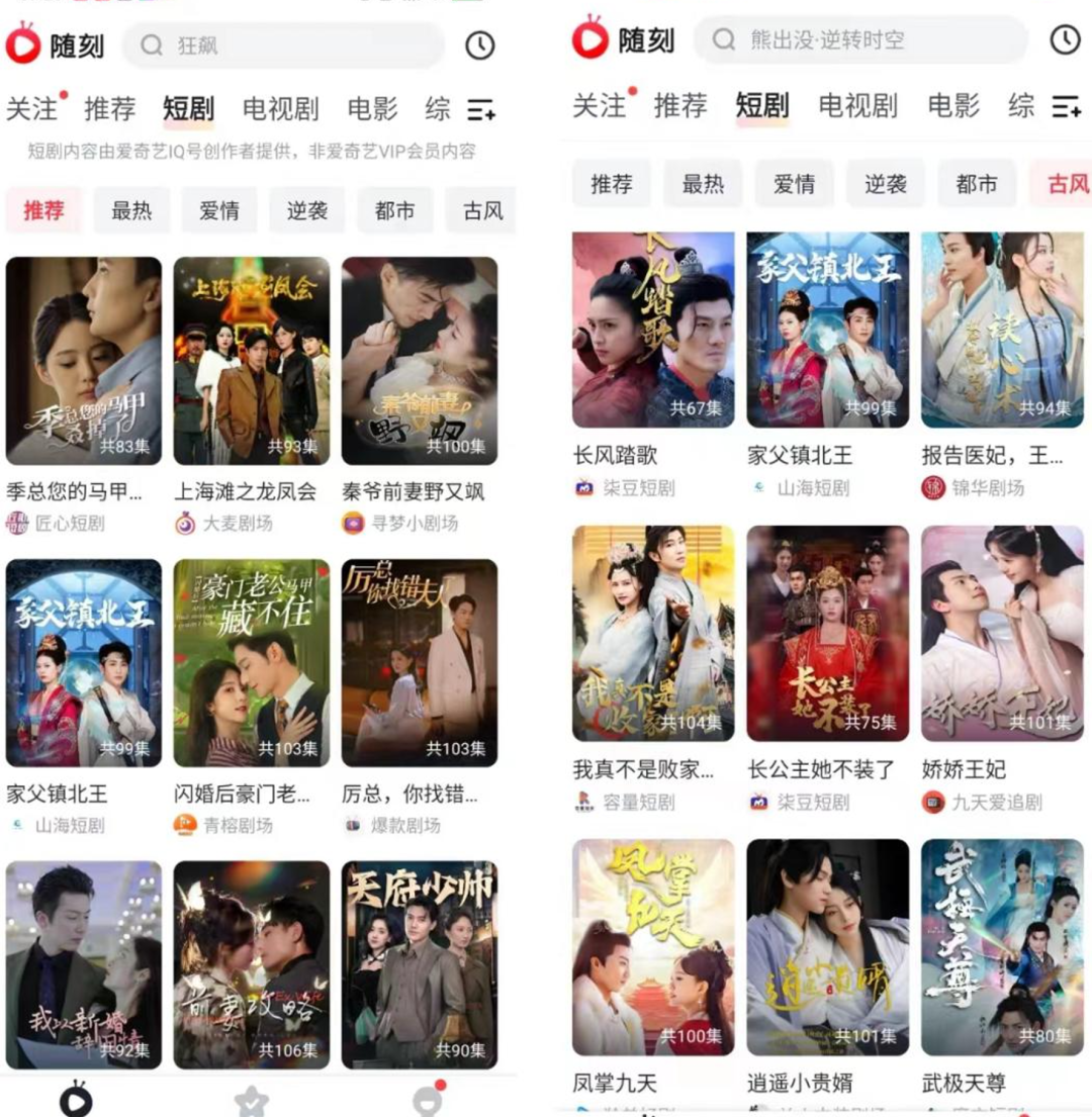 2023年12月,曾被爱奇艺“打入冷宫”的随刻APP官宣上线短剧频道,如《战神之令》《惹不起的她》《哎呀皇后娘娘来打工》等内容,涵盖现代爱情、都市逆袭、古风穿越、悬疑烧脑、玄幻仙侠等热门题材,凸显入局“分羹”野心。
