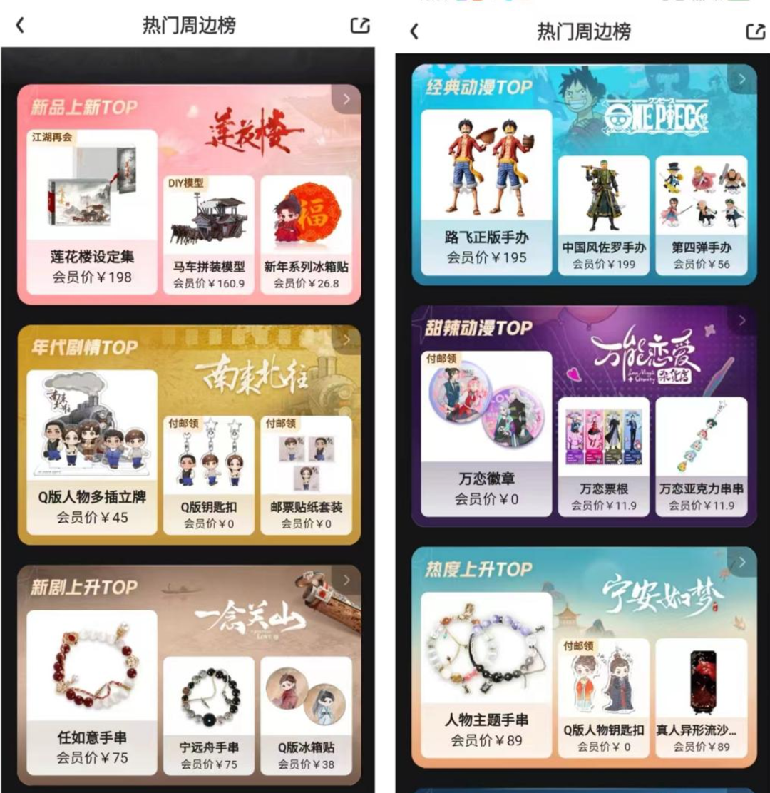 目前,爱奇艺为《南来北往》《莲花楼》《一念关山》《云之羽》等数十部热播剧搭建周边卖场,包括书籍、毛绒玩具、邮票贴纸、徽章等商品。